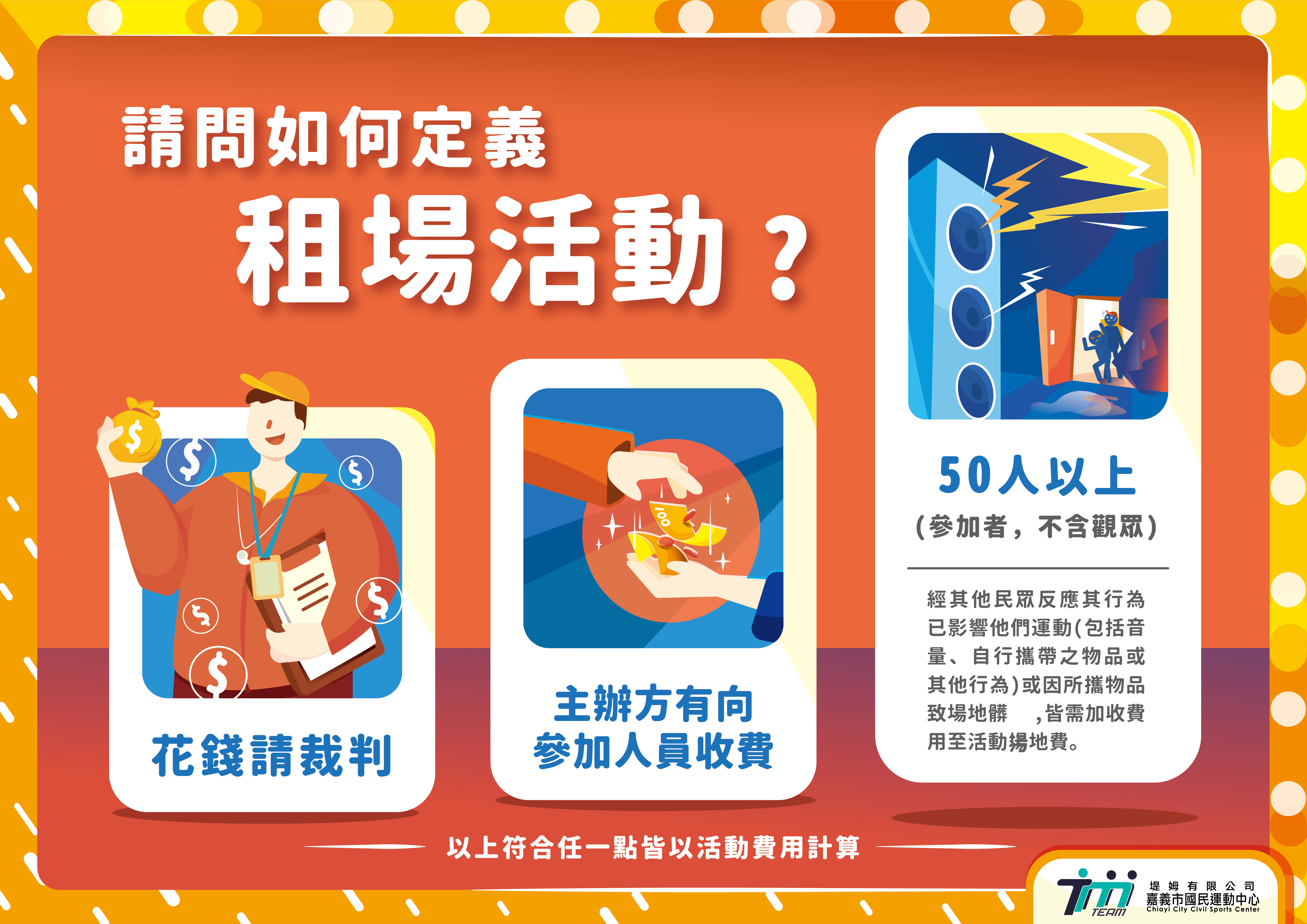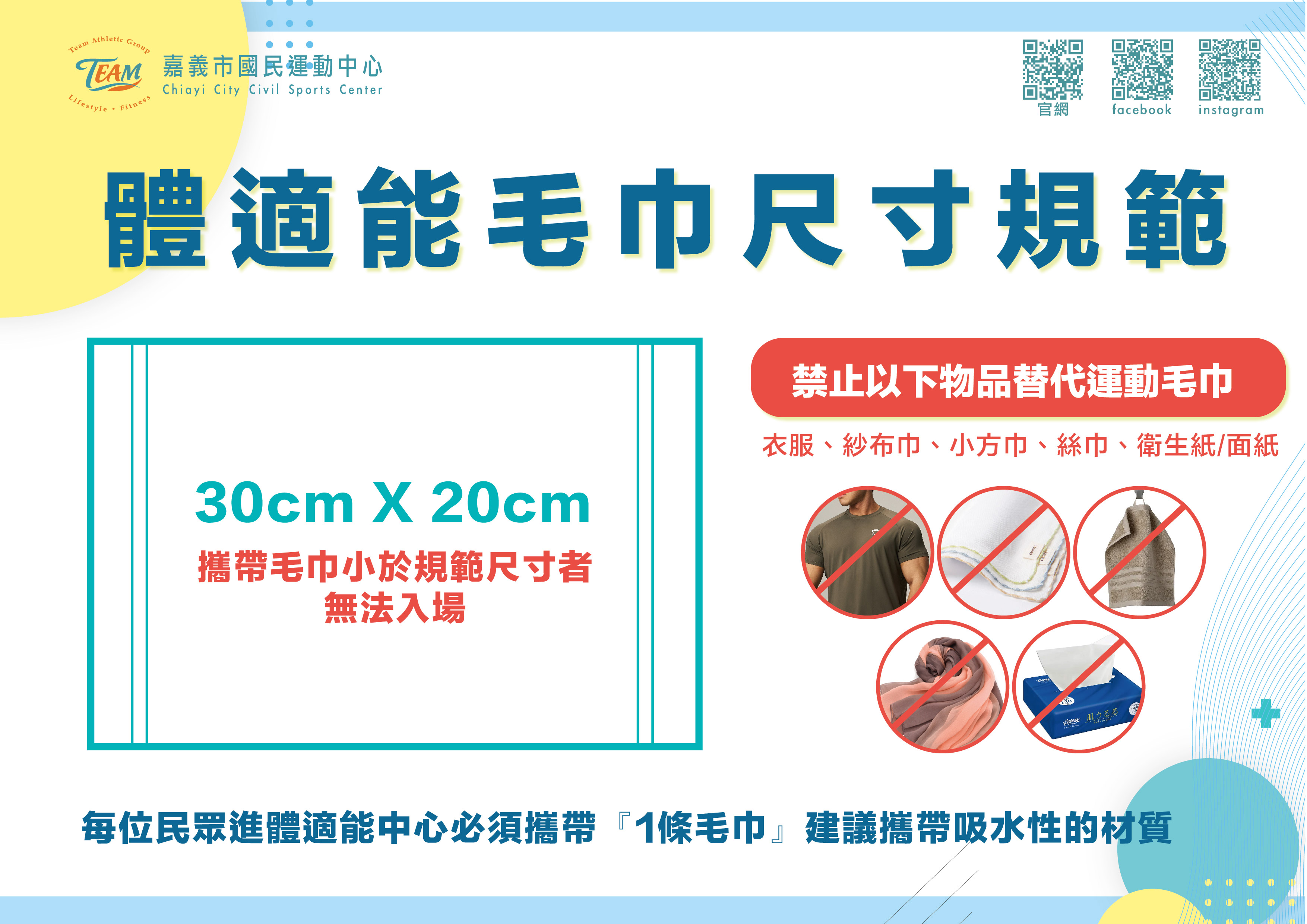 - 使用者未配合本公告或現場管理人員指示者,管理單位得依場館使用辦法,採取勸導、限制使用或暫停使用等管理措施。 Users who fail to comply with these regulations or on-site staff instructions may be subject to warnings, usage restrictions, or suspension.